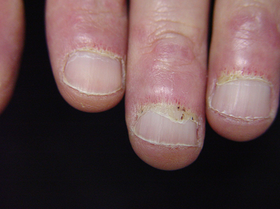 nail_fld_chng_dermatomyosit January 11, 2017 574 × 430 AM Report 01/10/17: Dermatomyositis Cuticular overgrowth, periungal erythema, dilated capillary loops Share this: Click to share on X (Opens in new window) X Click to share on Facebook (Opens in new window) Facebook Like Loading...