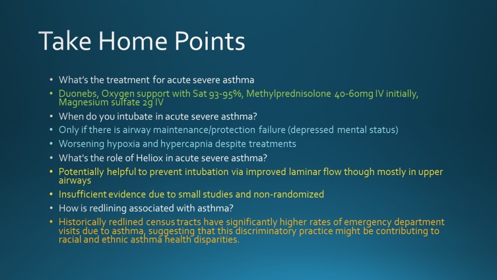Today we discussed the case of a young man with history of well controlled asthma who presented with subacute dyspnea, and productive cough with respiratory distress, thought to have severe acute asthma with likely triggers of smoking as well as poor air quality due to the California fires. Finally we discussed that his living in a neighborhood that was redlined throughout the mid to late 20th century contributes to his likelihood of ED presentations with asthma exacerbation.