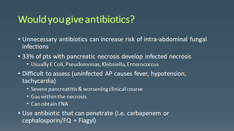 Today we had a middle aged male with hx of obesity and etoh who presented with necrotizing pancreatitis. We went over uncommon complications of pancreatitis
