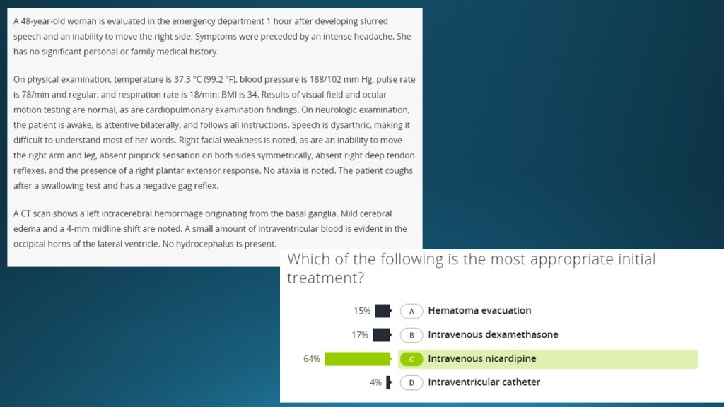 We also discussed a MKSAP question on management of intracranial hemorrhage, as review of American Heart Association’s guidelines for management of hypertensive emergency.