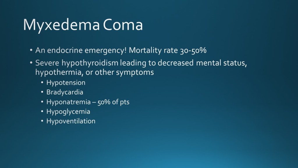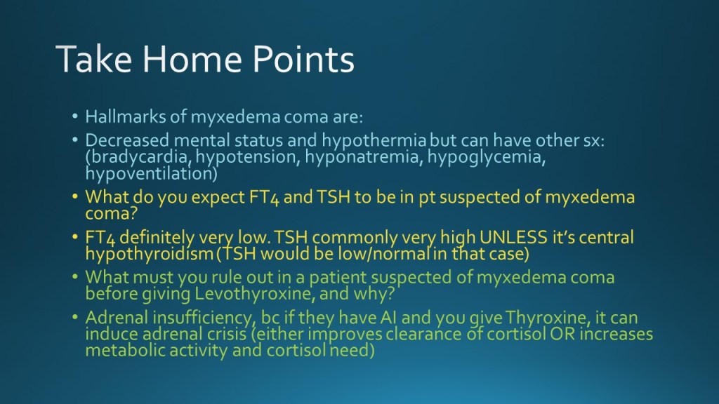 Today we discussed the case of a young woman with history of hypothyroidism who was unhoused and not taking medications for 2 months, presenting with subacute onset fatigue, with periorbital and bilateral lower extremity edema and lower extremity hyperpigmentation, found to have profound hypothyroidism vs mild myxedema coma.