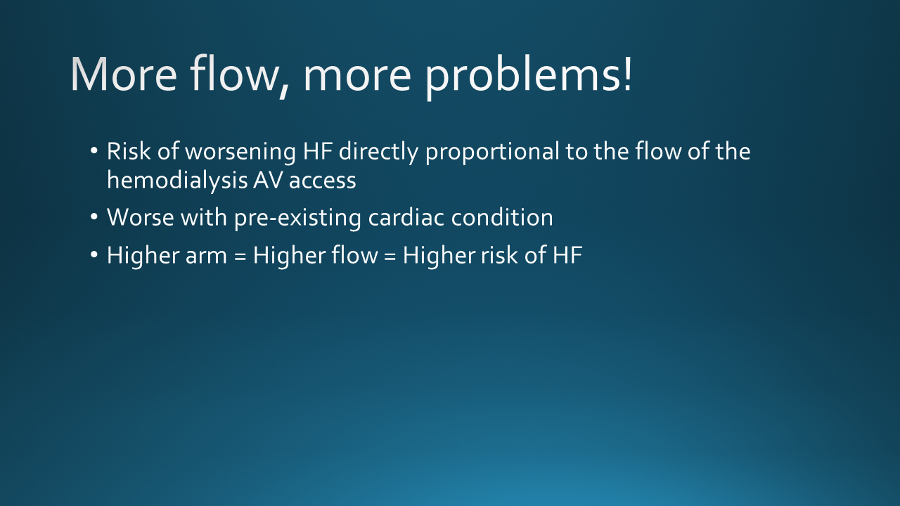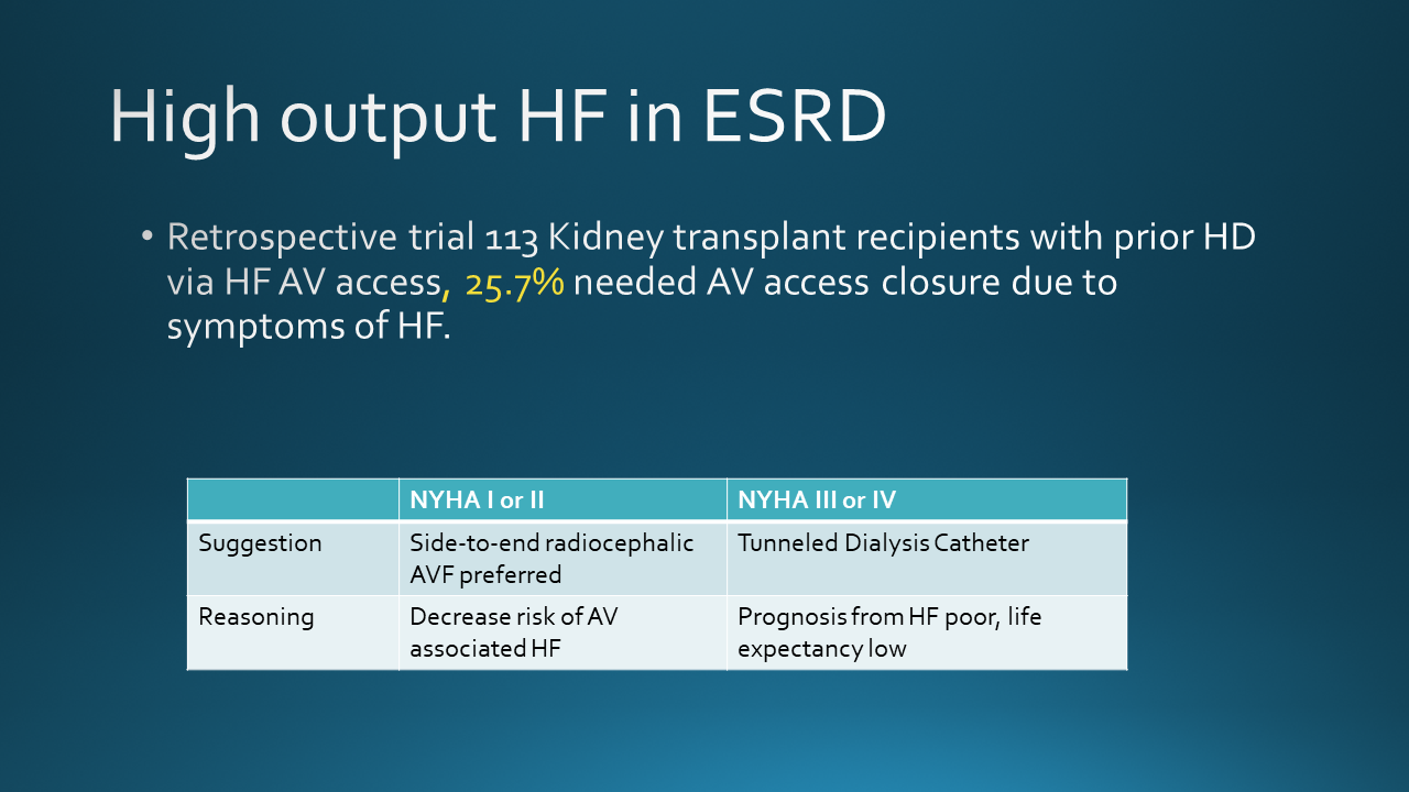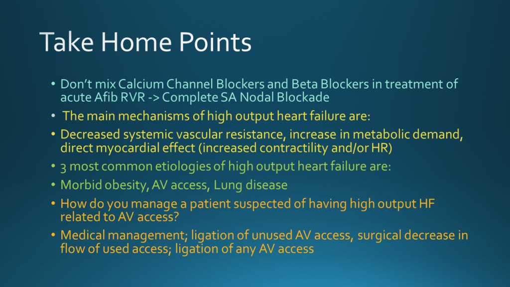 Today we discussed a case of a young woman with Lupus, Lupus Nephritis leading ESRD with recent transition from HD via AV Fistula to Peritoneal Dialysis, who presented with peritonitis with course complicated by afib RVR s/p dilt/metop w/ associated hypotension/bradycardia concerning for cardiogenic sock, found to have with new RV dilation, severe TR, and new HF. She was diagnosed with high output heart failure, AV access was ligated, with reversal of HF and TR!