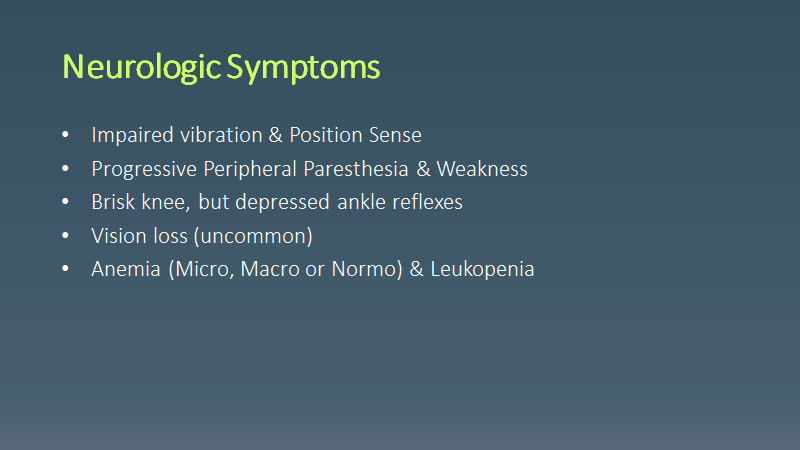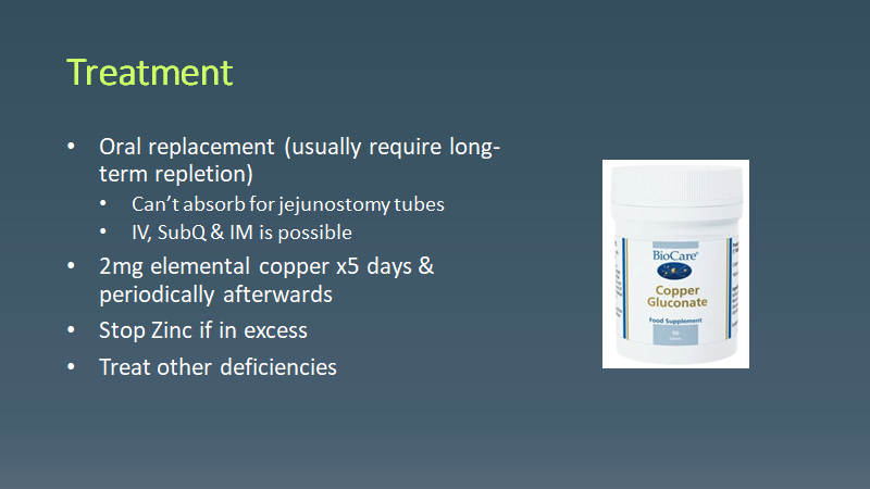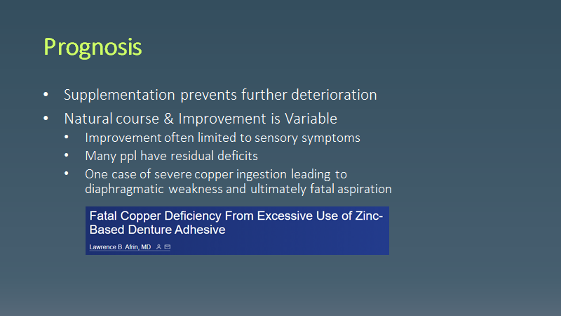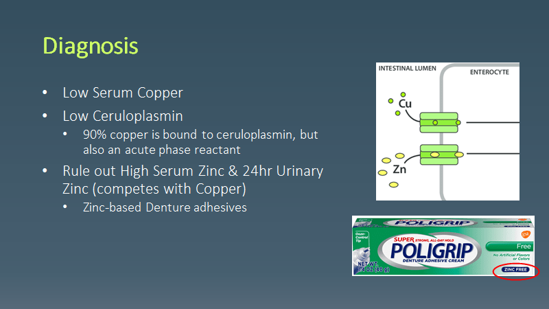Morning Report Copper Deficiency Myelopathy January 14, 2021 vmcimchiefs Leave a comment Today, we had a case of a female with hx of gastric bypass who presents with progressive peripheral numbness and eventually weakness due to copper deficiency Share this: Click to share on X (Opens in new window) X Click to share on Facebook (Opens in new window) Facebook Like Loading... Related
