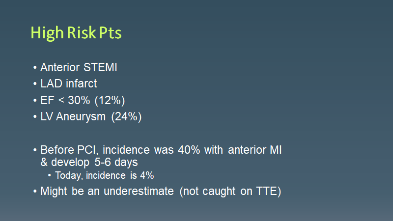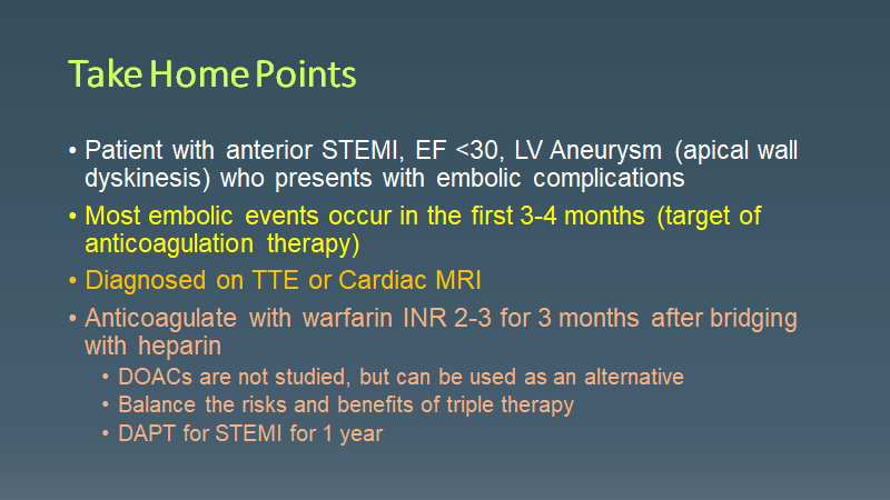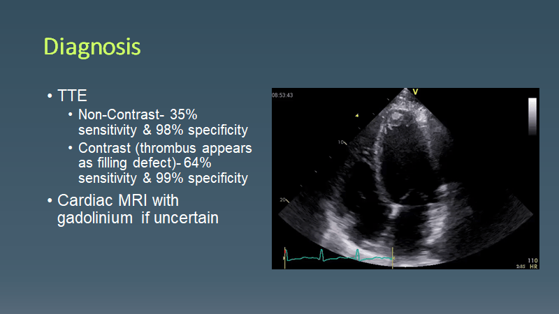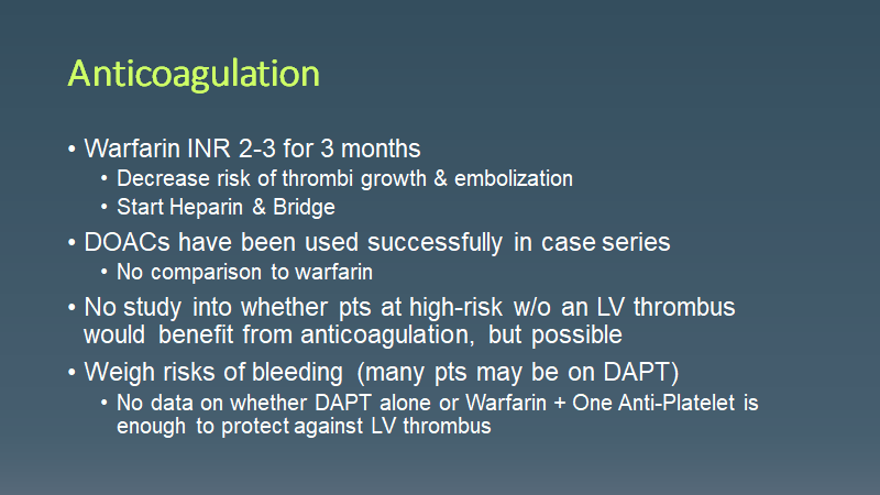 Morning Report LV Thrombus March 15, 2021 vmcimchiefs Leave a comment Today we had a case of pt with HFrEF who presented with an ACS event c/b LV thrombus causing RLE occlusion requiring amputation Share this: Click to share on X (Opens in new window) X Click to share on Facebook (Opens in new window) Facebook Like Loading... Related