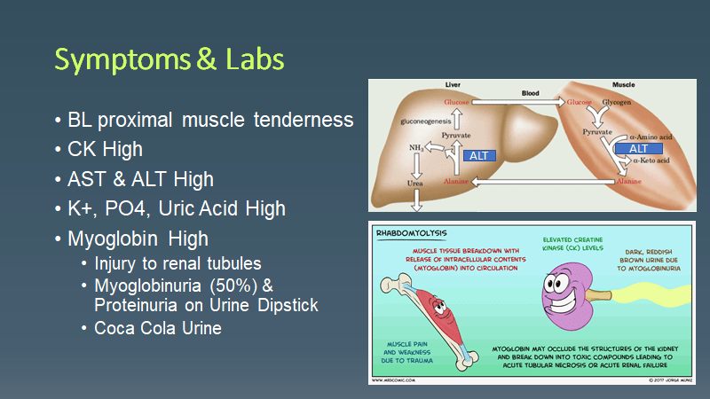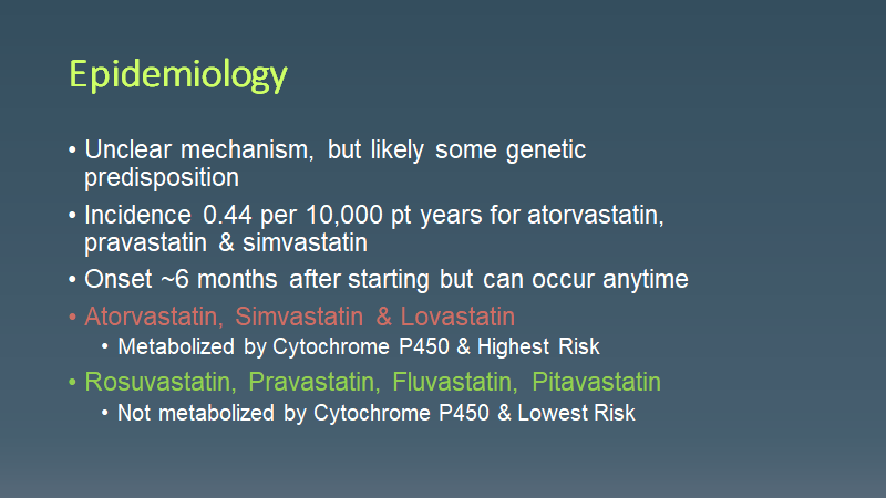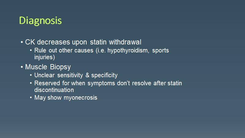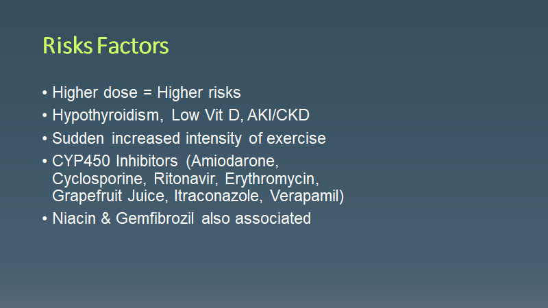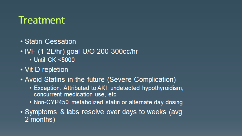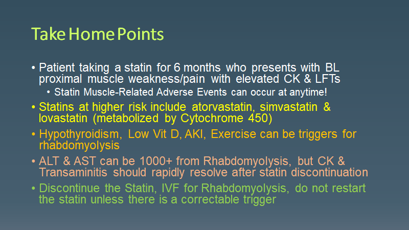 Morning Report Statin Rhabdomyolysis March 15, 2021 vmcimchiefs Leave a comment Today we had a patient presenting with subacute weakness 6 months after starting a statin and found to have statin rhabdomyolysis. Don’t forget that it can occur at any time (but usually 6 months after starting)! Share this: Click to share on X (Opens in new window) X Click to share on Facebook (Opens in new window) Facebook Like Loading... Related