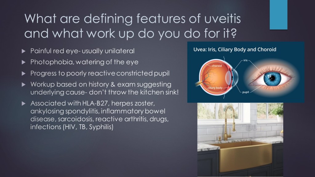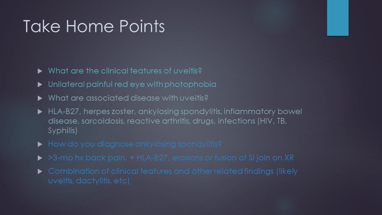 Morning Report Uveitis + Ankylosing spondylitis April 21, 2021 vmcimchiefs Leave a comment Today we discussed the case of a young woman with subacute onset URI symptoms and polyarticular arthralgias with acute onset unilateral painful red eye and photophobia, in context of recent travel to Texas and insect bites. Share this: Click to share on X (Opens in new window) X Click to share on Facebook (Opens in new window) Facebook Like Loading... Related
