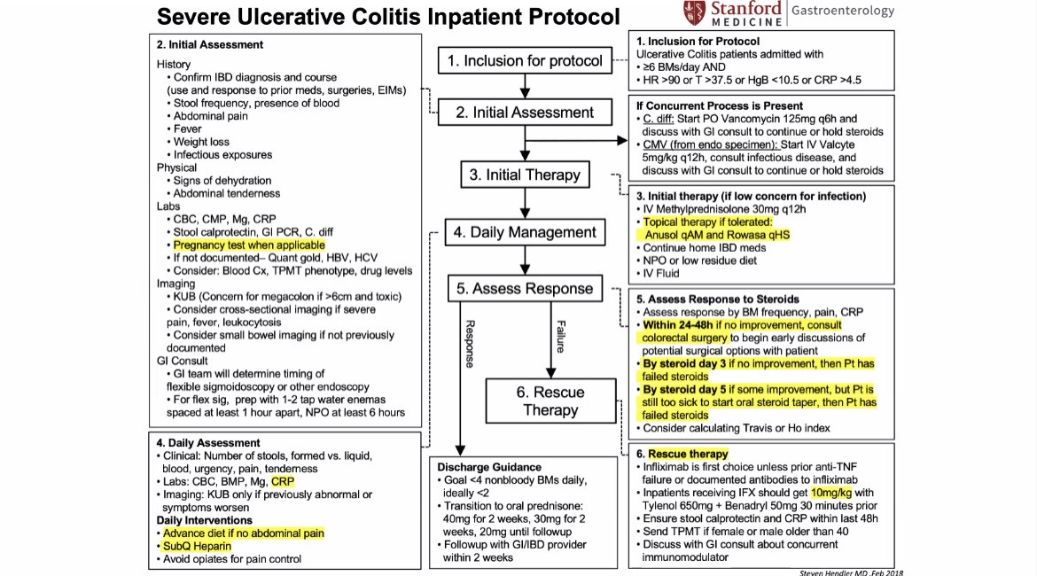 We discussed a case of a middle aged woman who presented with acute on chronic abdominal pain, bloody diarrhea, tenesmus, found to have a new diagnosis of ulcerative colitis.
