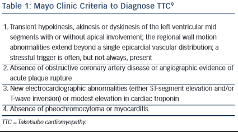Mayo Clinic Criteria can help with diagnosis of takotsubo cardiomyopathy.