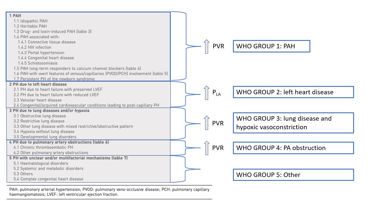 PH is defined as mean PA pressure (PAP) of >20mmHg at rest. Here is the 5 groups of PH. Remember PAH is a specific subgroup of PH. Group 1, 3 and 4 require mean PAP >20mmHg; Wedge<15mmHg and PVR>3 WU. Group 2 and 5 require mean PAP >20mmHg, wedge>15mmHg and PVR <3Wu.