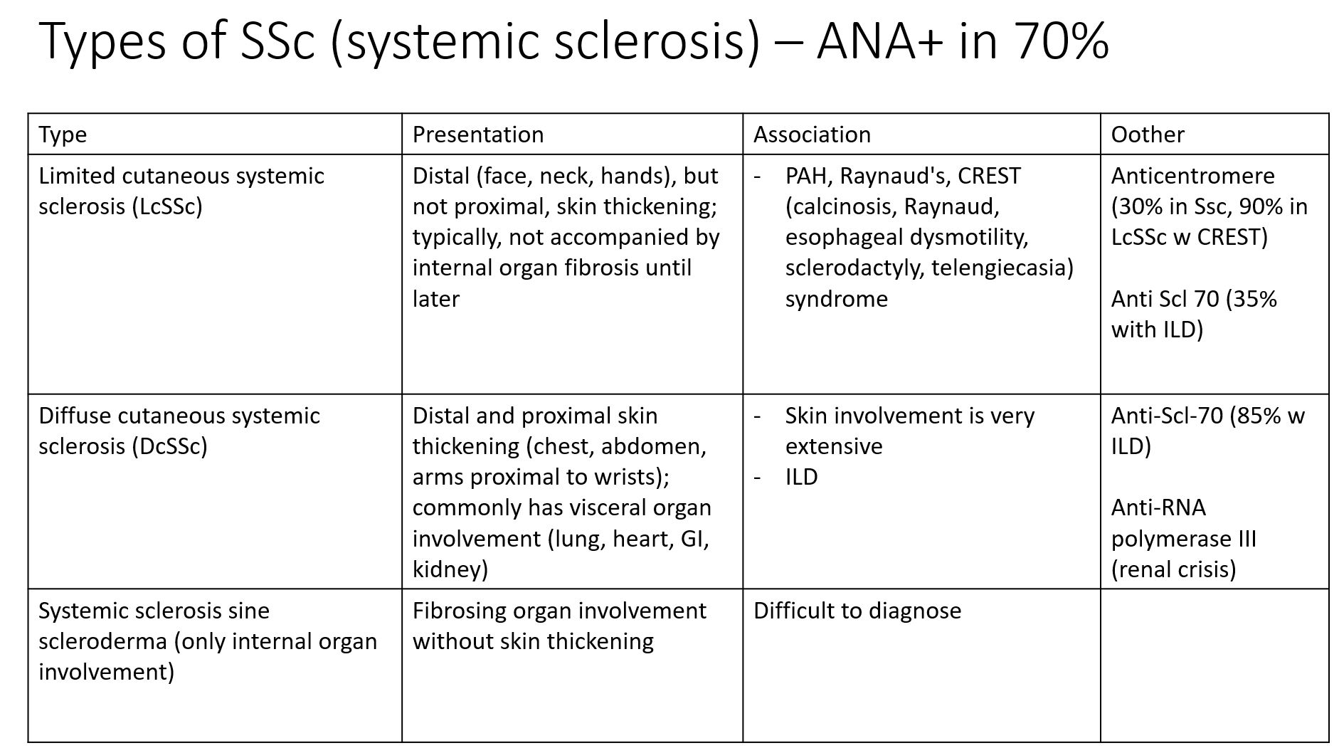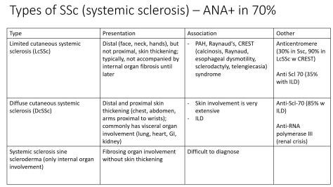Remember ANA is positive in 70% of systemic sclerosis but other antibodies are associated with more specific complications of systemic sclerosis. Here is a table to summarize.