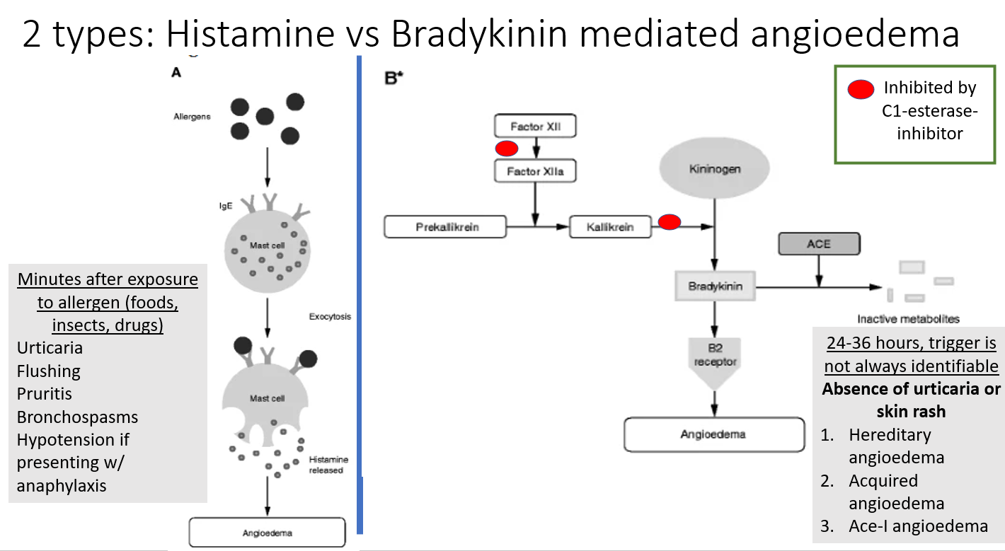 An elderly male with alcoholic cirrhosis and metabolic syndrome with long term ace-inhibitor use and recent initiation of alogliptin presenting with acute onset tongue swelling. He did not have any identifiable triggers prior to this including new foods/allergens/insect bites. He was admitted to ICU for airway monitoring. It is important to remember the type of angioedema as the treatment/management will differ. Symptoms that indicate a histamine mediated angioedema include urticaria, flushing, pruritis and bronchospasms. Symptoms that indicate a bradykinin mediated angioedema presents with lack of urticaria or skin rash. You should also ask for family history of episodic swelling or recurrent abdominal pain (angioedema can present in abdominal wall).