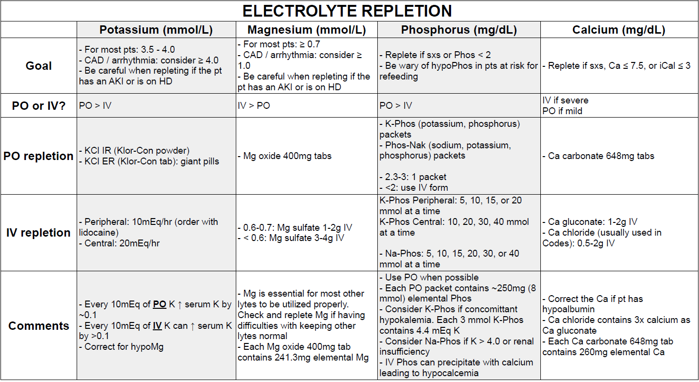 Electrolyte Repletion These are general guidelines for electrolyte repletion.Please ask your senior resident and/or attending if you have patient-specific questions. Share this: Click to share on X (Opens in new window) X Click to share on Facebook (Opens in new window) Facebook Like Loading...